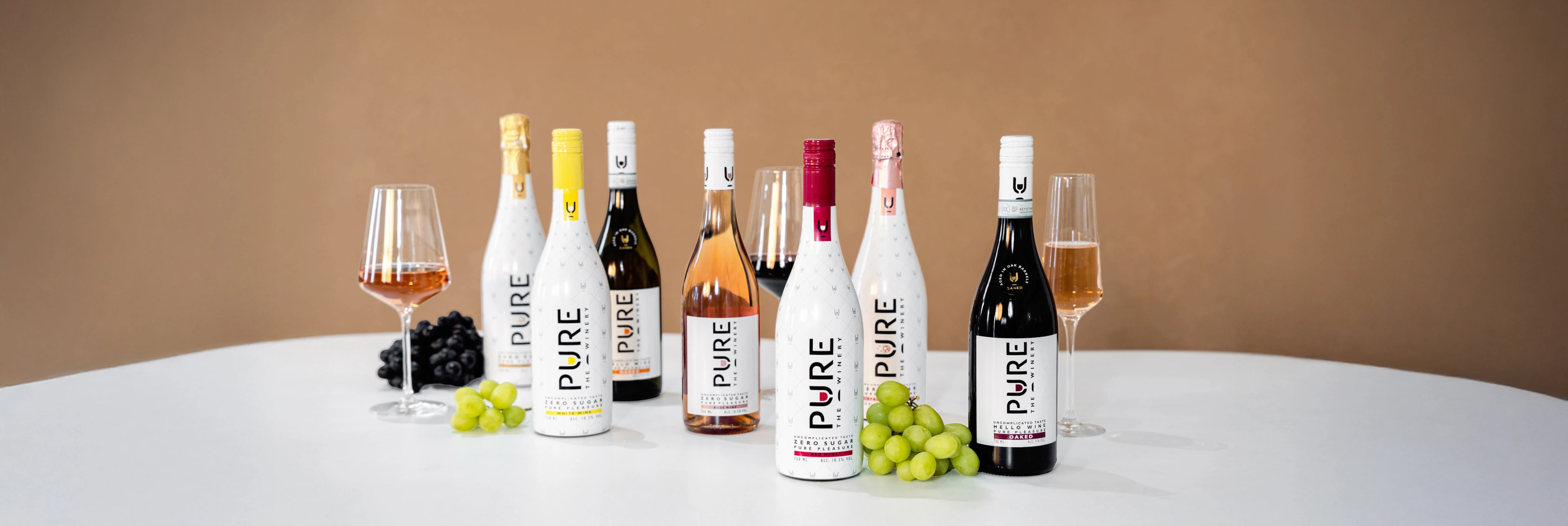 * At least 30% fewer calories compared to wines containing ≥ 12% alcohol, carbohydrates and sugar. The wines of Pure The Winery contain 10.5% alcohol, 0 grams of carbohydrates and 0 grams of sugar.